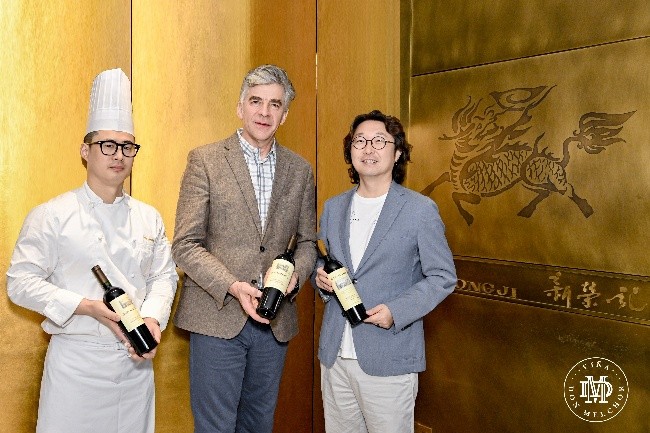 上海新荣记(BFC外滩金融中心店)主厨马师傅(左)、魔爵酒庄首席执行官兼首席酿酒师恩里克·蒂拉多先生(中)、首位华人侍酒师大师吕杨先生(右)于品鉴现场