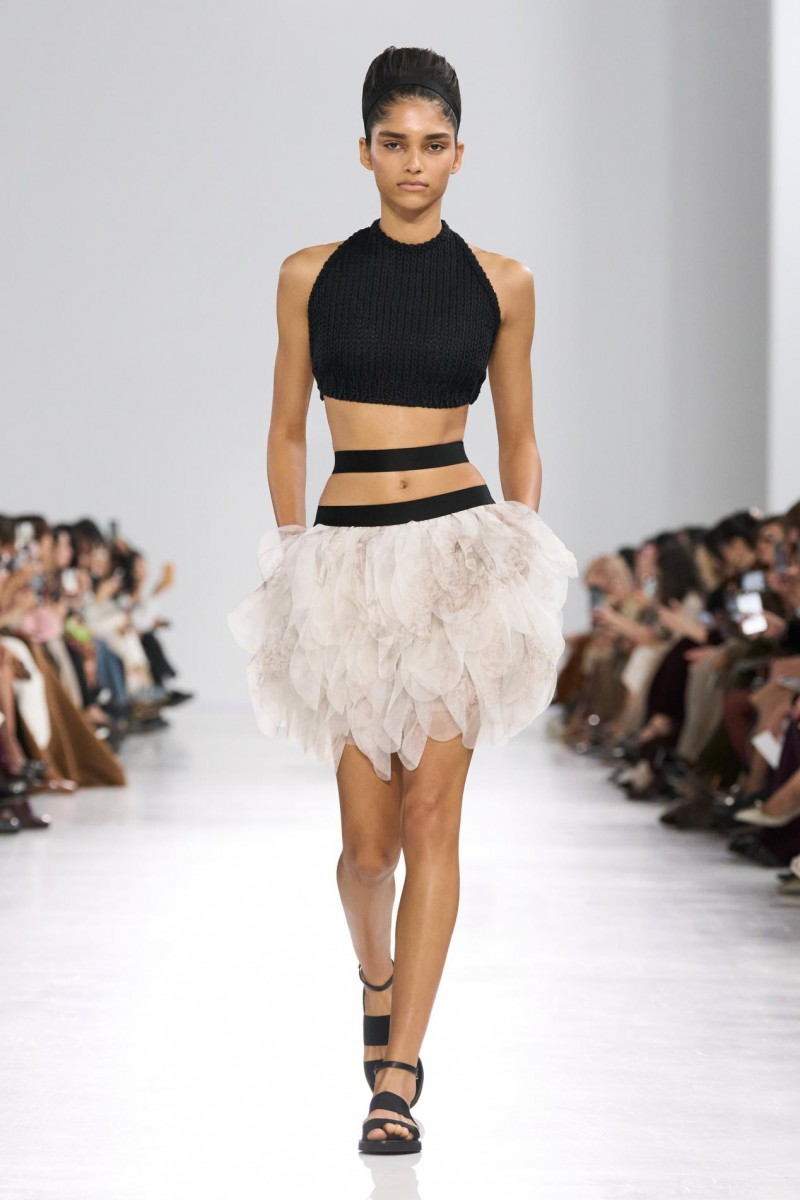 一条极简的铅笔裙,腰臀处浮起一束轻盈丰盈的薄纱,宛若深海生物的华饰,在克制轮廓上划出一道自由的弧线;一袭欧根纱裙,由数百片手工剪裁与折叠的布片构成,似异域温室中的奇花盛放,又如海葵触须随水流轻舞。