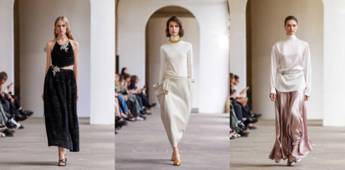 本次 “重逢MeetAgain” 大秀构建了一个扎根女性精神的美学世界,设计师通过时装语言演绎暗影与光芒、柔软与结构的精妙对话,诠释刚柔并济的女性力量。系列作品中,流畅的裙装线条勾勒出女性柔美的曲线身型,而廓形西装、酷感夹克等充满力量感的男性化服饰语言,则被赋予了流动的形态美感,轻盈羽毛、立体花卉刺绣与精致钉珠等元素的点缀,让整个系列既流淌着绰约之姿,又不失当代精致质感。