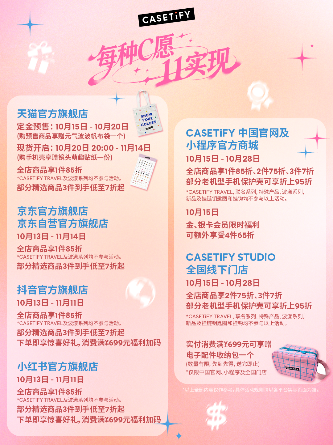 每一种C愿,都用不同的方式来兑现!当「新 iPhone」遇上「新鲜感」,满足追求新鲜的你;限量产品与IP联名系列,属于钟爱小众、热爱收藏的你;多功能电子配件的自由组合,适合热爱潮流百搭的你;而质感满分的波漾之选,则献给极简主义的你。无论是哪一种情绪、哪一种期待,CASETiFY 都希望用贴近生活的创意设计,让每个你都能在双十一找到独属的个性表达。