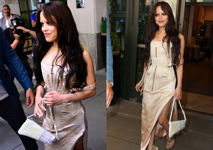 左:珍娜·奥尔特加上身AUPEN Nirvana棕色手袋搭配 Lumière包挂
