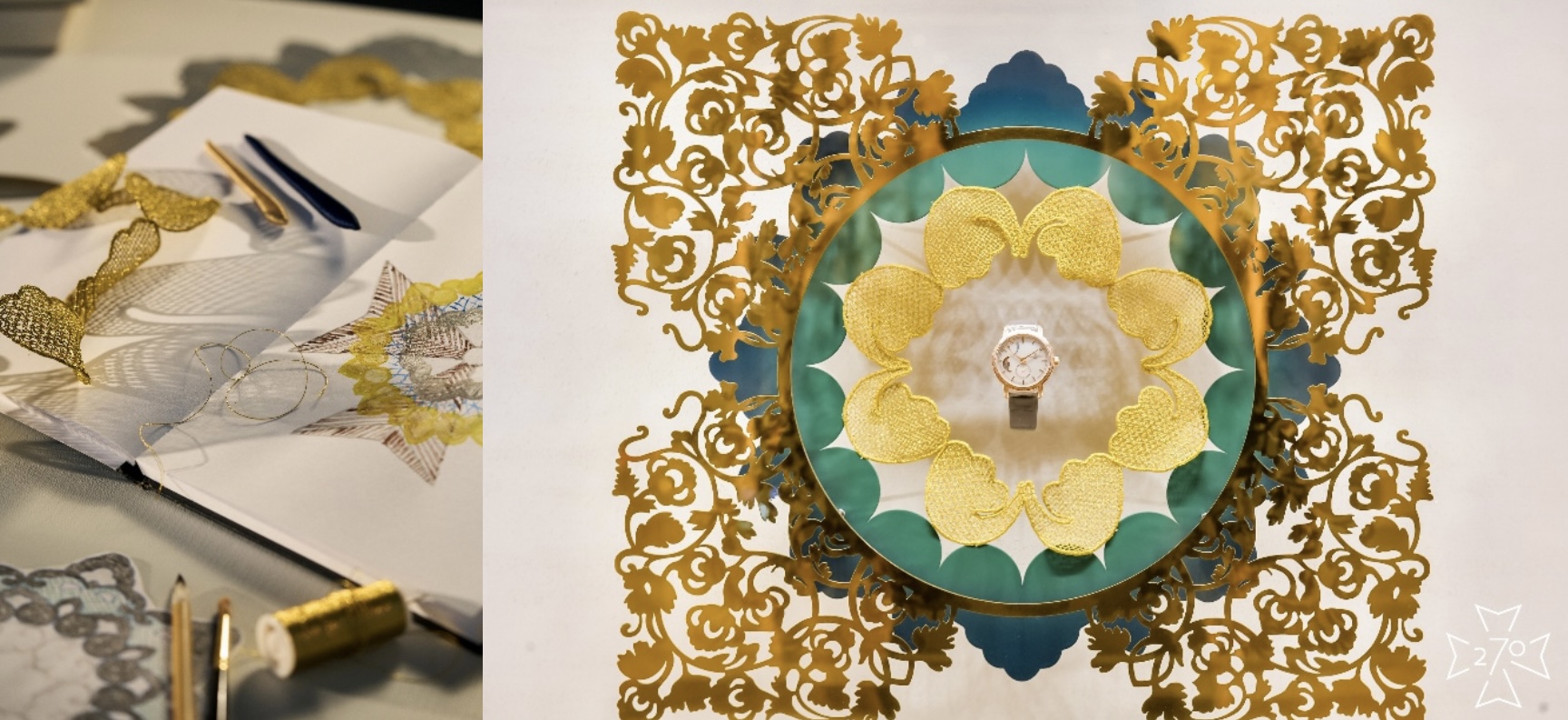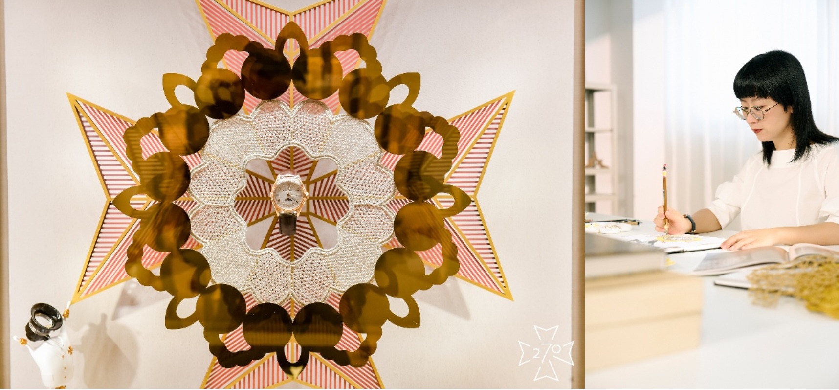 布为纸、丝线为笔,依纹挑孔,镂空成韵,这一过程不仅是对手艺的极致锤炼,更需空间构想与心神专注。挑花由刺绣接续,多种针法层叠交织,虚实相映,令花边焕发出如诗般的韵律与张力。这种追求极致的工艺哲学,与江诗丹顿制表大师们对于精湛工艺的追求相契相合。橱窗之中,萧山花边以八瓣花苞形纹样为核心,环环相扣、连接成圆,既承袭其一贯的几何对称美学,亦为宝相纹的一种延展形式,寓意圆满、繁盛与文化的永续生长。借由金线与光影的交织演绎,传统纹样在当代语境中重焕新生。