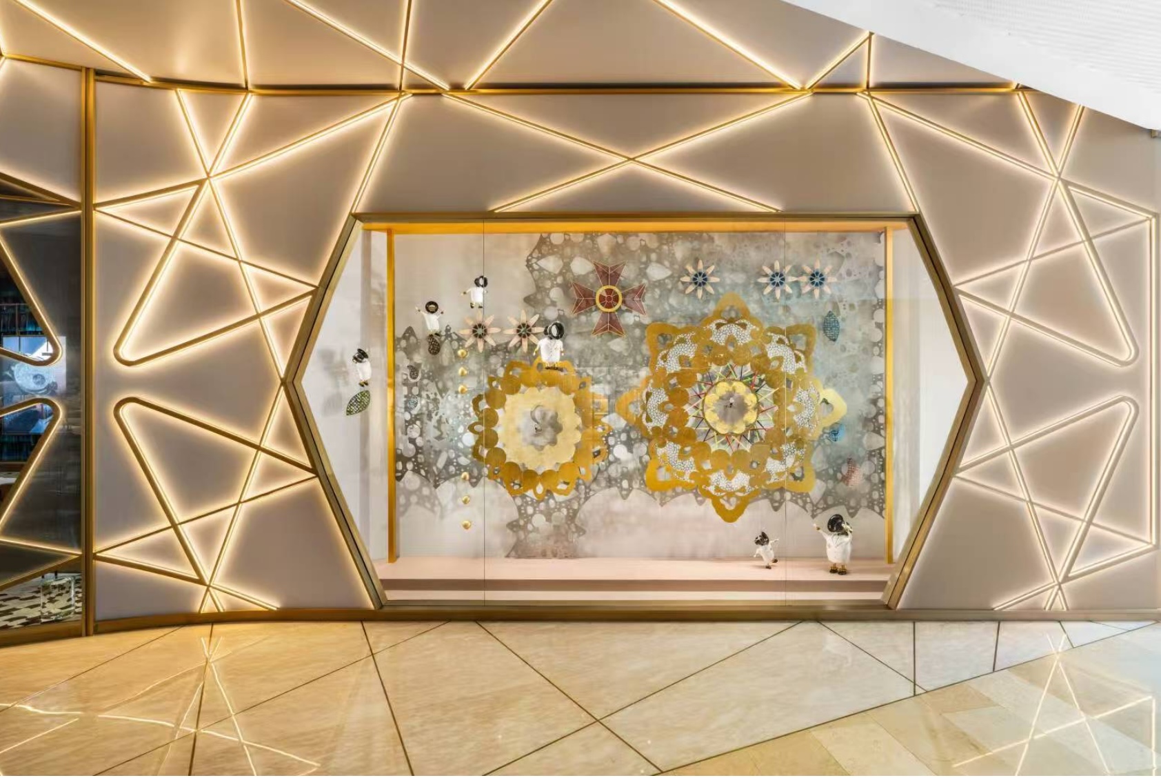 橱窗背景以品牌标志性暖金色铺陈,细绘江诗丹顿延绵至今的高级制表“臻途”。正如传统纹样在岁月流转中不断焕发新生,江诗丹顿的传奇制表“臻途”亦在时光长河中赓续前行。本次创作以互联共生、永续生长的艺术形态,化为文明与时间的深邃对话,生动诠释了江诗丹顿“臻途”精神的永恒延续。