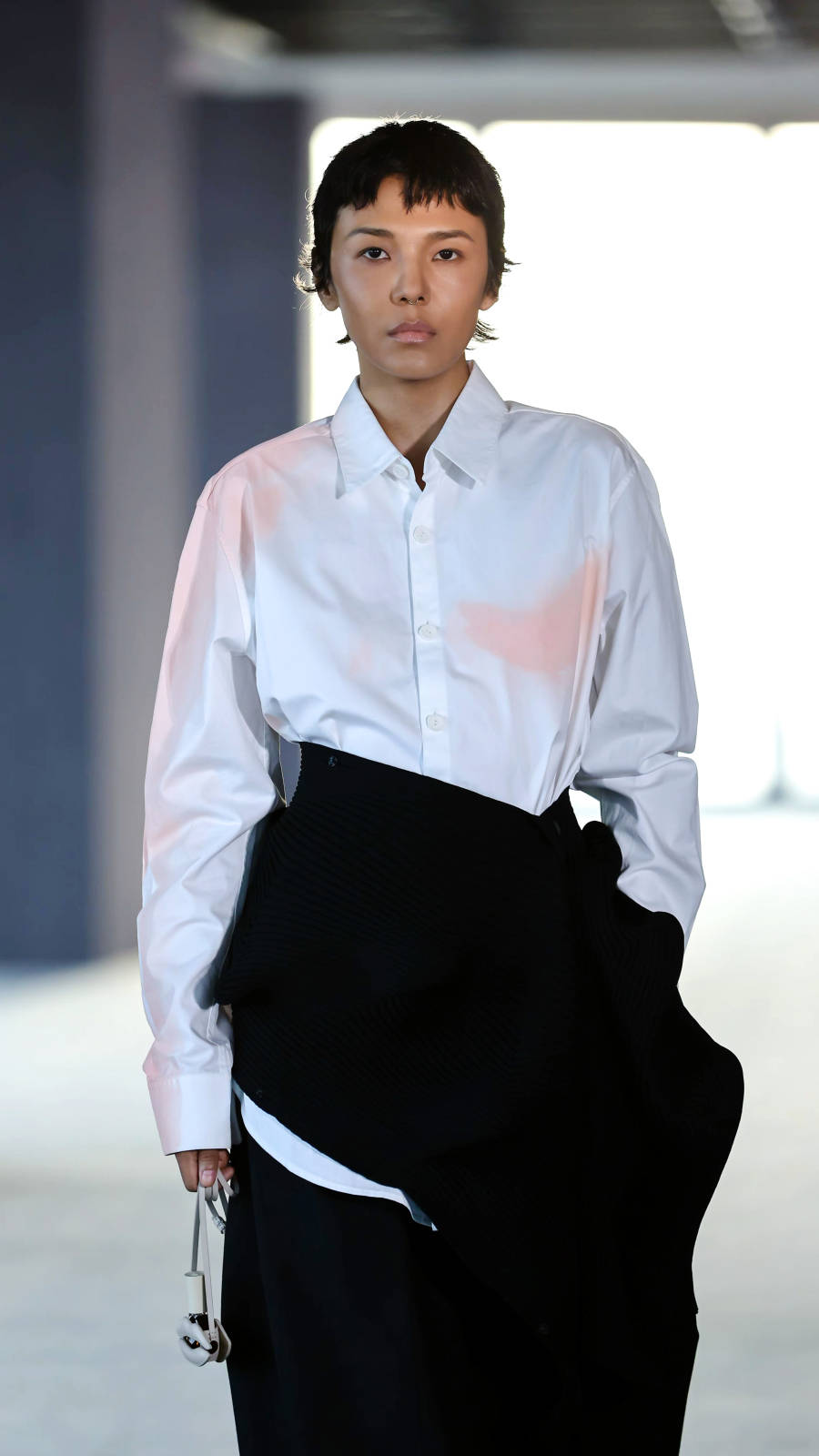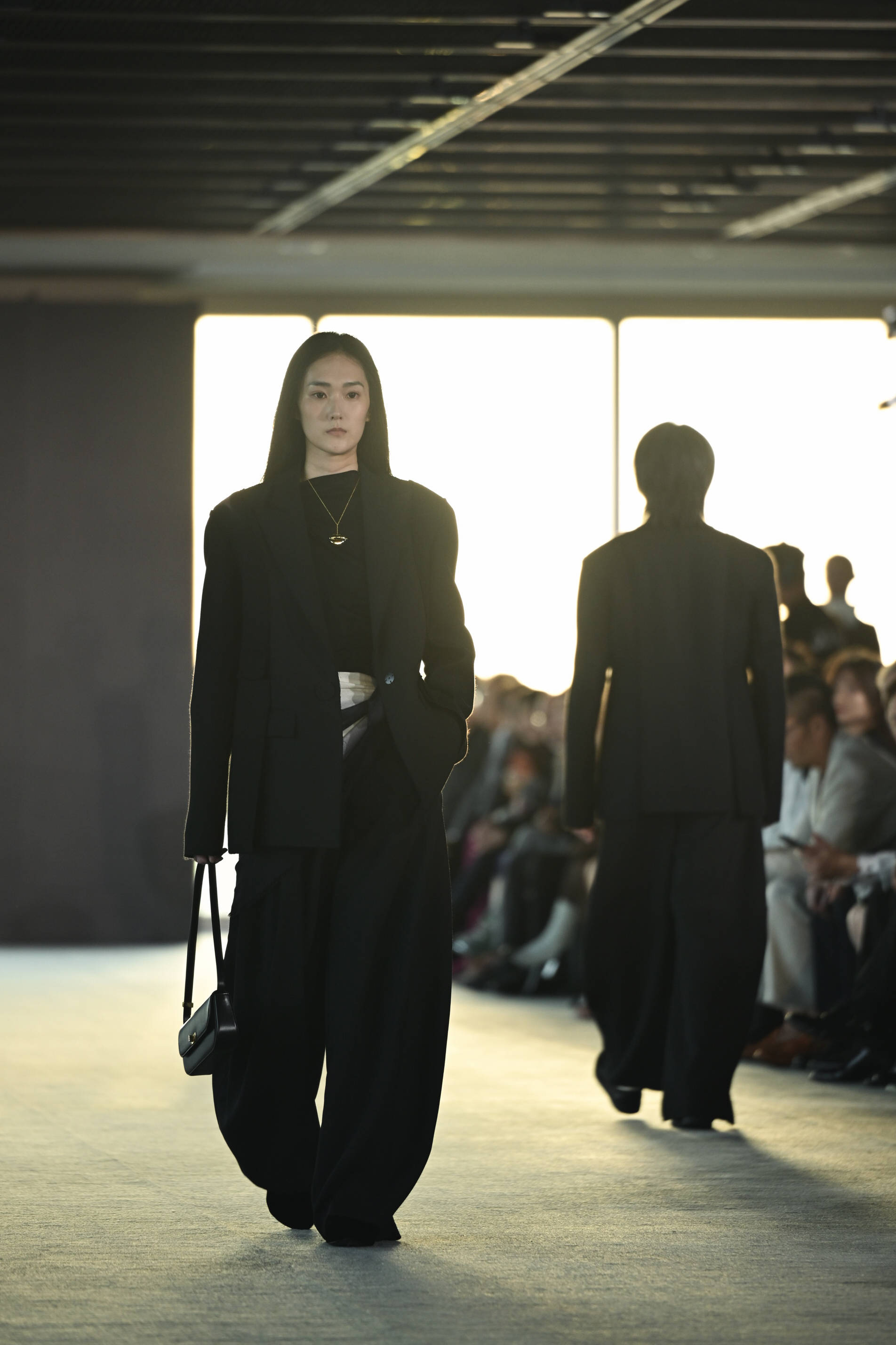 T台上,模特走秀的身影与鳞次栉比的摩天大楼光影交错,映衬出些许超现实主义的流动感。廓形随灯光与模特步伐流动,时间在空间中缓缓延展。观众仿佛置身于服装与艺术交错的场域,感受每件作品中承载的记忆与情感。