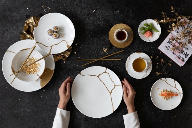 “我为日本16世纪一种被称为‘金缮’(Kintsugi)的技艺而深深着迷,其理念是以漆为粘合剂,在陶器上用金进行醒目的修补,同时提高审美价值。在利摩日的工作室里,我曾如同书法家一般,精神高度集中,制作了同系列的12件盘子,一气呵成。那时灵感如闪电般袭来。”