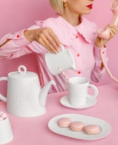 白瓷质地自身精美的视觉效果,加之精细的纹理对照和娴熟的上釉工艺,摩登而富有诗意。星星点点的雕饰仿佛海边泡沫,极为优雅而现代的餐桌由此诞生。