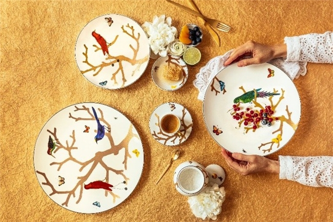 其中,「金枝翠雀 Aux Oiseaux」系列以十七世纪奇物柜文化为灵感,将珊瑚枝、雀鸟与金色枝条化为瓷面上的诗意景致;「阳日之光 Sol」系列以璀璨金线与明快色彩描绘光的流动,演绎当代餐桌的欢愉格调;而「华灯初上 Lithophanie」系列,则承袭1828年利摩日发明的透光浮雕技艺,光影交织间浮现出如大理石般温润的立体花纹,令人叹服。