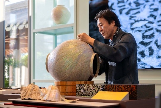 展区的中央放置了大型月亮陶罐,首尔市非物质文化遗产第1号漆艺匠人孙大贤大师将在现场演示乐传统螺钿漆器制作工艺,以其精湛技艺吸引了众多嘉宾惊叹。