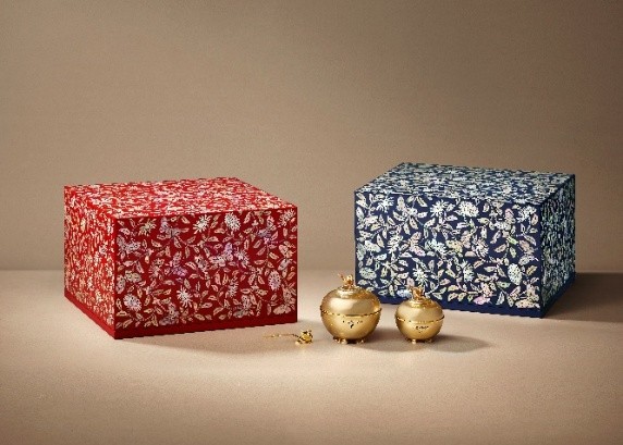 凝颜系列被作为韩国国家级赠礼,被盛载凝颜致臻系列的螺钿漆器礼盒。礼盒由首尔市非物质文化遗产第1号漆艺匠人——孙大贤(Sugok Sohn Dae-hyun)大师匠心打造。为契合国际级交流场合的礼赠需求,THE WHOO后特别呈现两款独具匠心的礼盒设计。