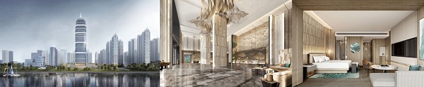从左到右(效果图):宜昌威斯汀酒店外观、大堂及客房