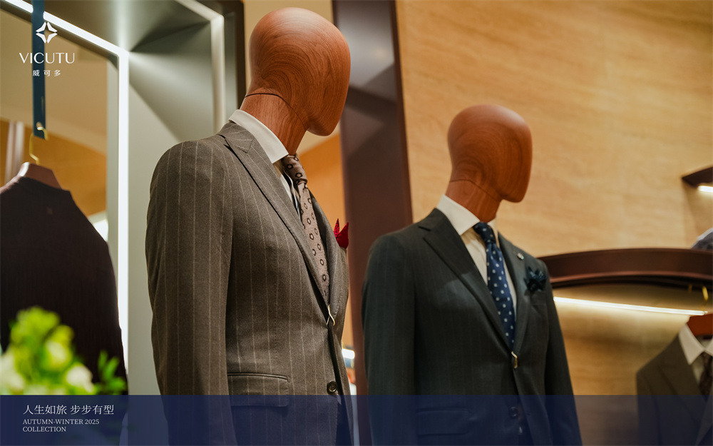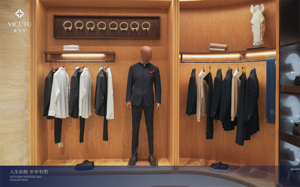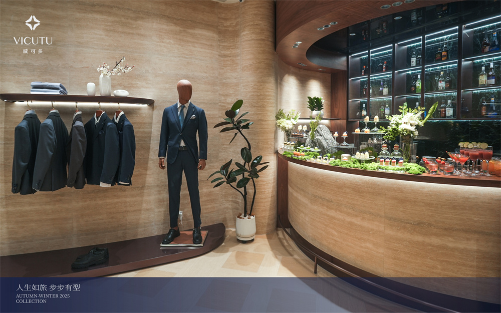 作为中国高端男装的代表,VICUTU在楚河汉街这一国际品牌云集的舞台上,以东方哲思与现代设计语言并置的空间设计,展示了民族品牌的审美自信与文化底气。也再一次诠释了其“正装全场景穿搭顾问”的品牌定位,从商务通勤到旅行社交,为现代男士提供贯穿多种场合的着装解决方案。