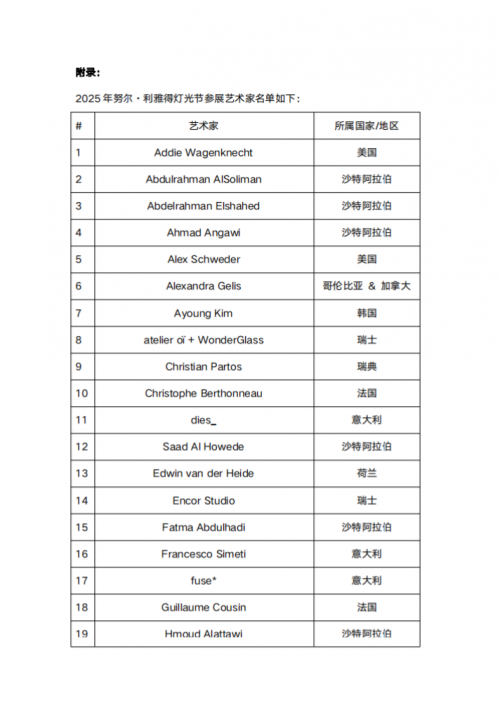 2025年努尔·利雅得灯光节参展艺术家名单如下: