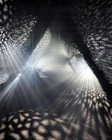Ahmad Angawi(沙特阿拉伯),《光影算法:猎鹰》,2025年 - 作品灵感源自纳吉迪传统萨杜(Najdi Sadu)纹样与沙特猎鹰,探索传统、动态与变革的交汇点,蕴含庄严韵律与几何美学。书法般的设计形态舒展延伸,于空间中自然栖居却无张扬之感,传递出内敛而恒久的表达。