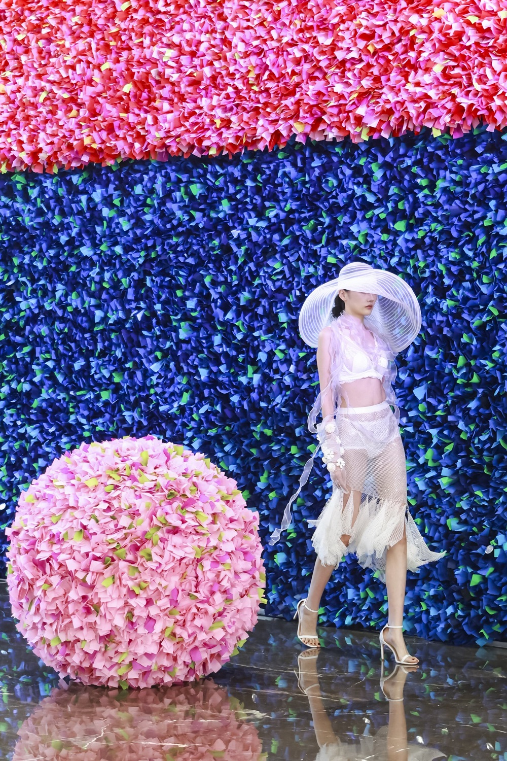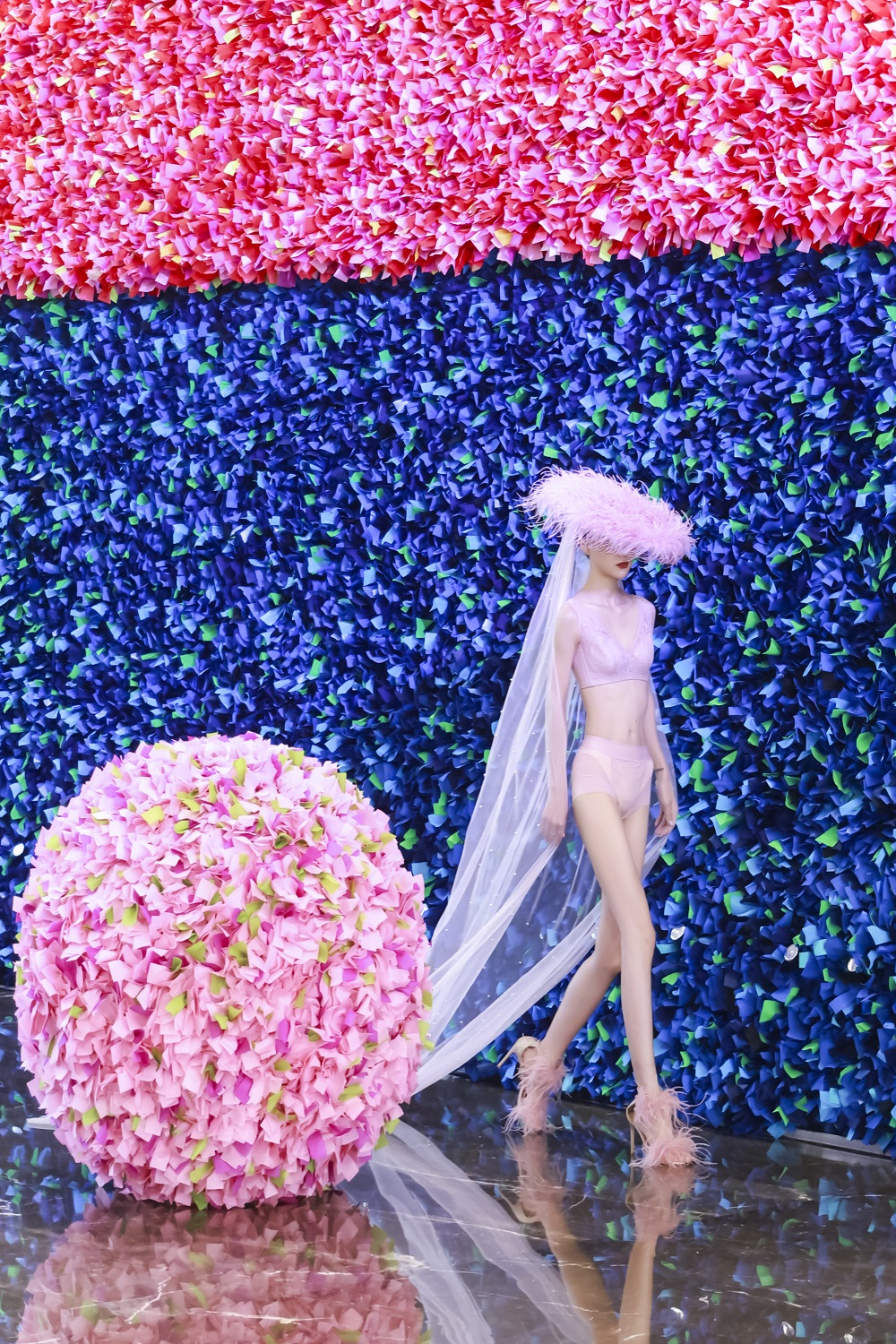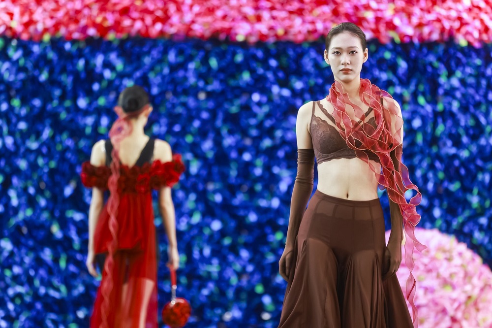 本次大秀的核心,是一场关于“内在性”的视觉探索。艺术家古原将转瞬即逝的欢庆彩屑,转化为对瞬间与永恒的思考表达;而赫本西施则将内衣呈现于台 前,将其视为艺术的载体,实现了从衣物到艺术表达的转变。当模特在花团爆破的瞬间坦然屹立,一幅 “向内生长,向外绽放” 的动态意象达到了视觉的焦点。它以近乎视觉寓言的形式向所有人传达了内在蕴养和外在绽放的深远内涵。