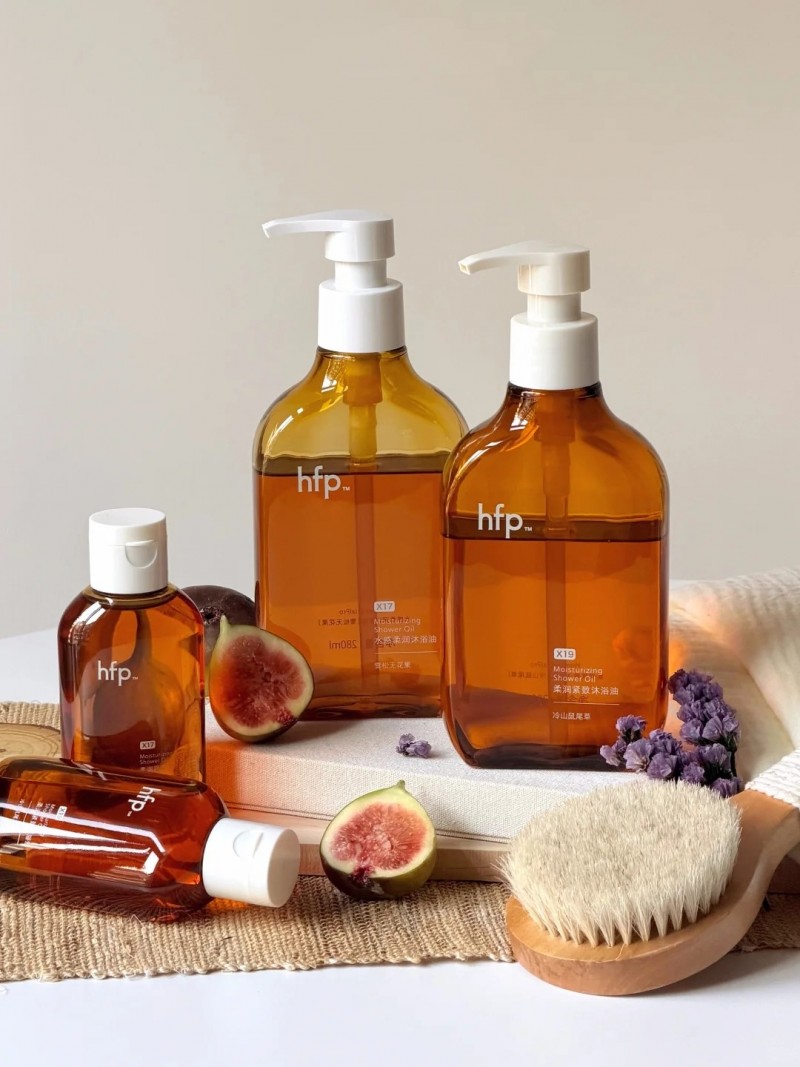 hfp沐浴油主打不加1滴水的纯油配方,7 种植物精油做清洁与滋养载体,遇水“秒乳化”,好冲洗不假滑。而且纯油能把防晒/素颜霜的成膜剂溶出来,再配面护级养肤成分,洗完是真的软嫩不紧绷。