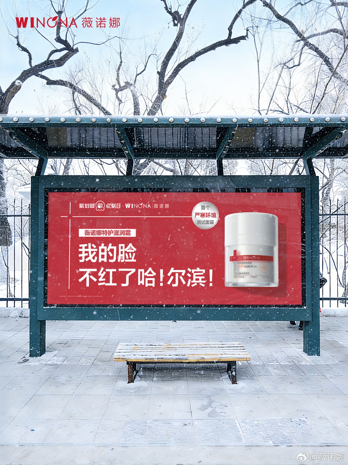 配合新品上市,本月在哈尔滨冰雪季人流密集的黄金公交线路上,「薇诺娜特护滋润霜修护专列」持续运行。通过公共交通这一覆盖广泛、高渗透性媒介,薇诺娜成功进入游客与本地居民日常视野,也将“我的脸都不红了”与第二代特护滋润霜牢牢绑定在人们出行记忆中。