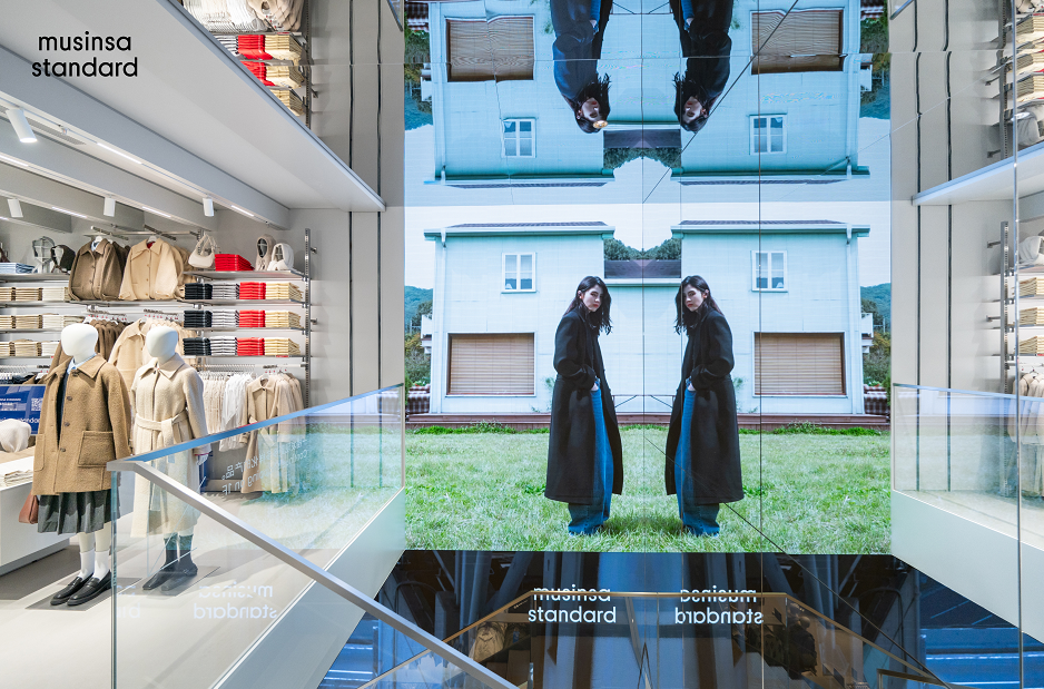 Musinsa Standard 上海淮海百盛店以 “Total Look” 整体造型陈列为核心,通过成套风格展示替代传统单品陈列,提供更加直观、高效的选购体验。店内近 1,500 款男女装单品覆盖从基础到趋势的多元风格,并以清晰的空间布局提升逛店效率。店铺同时打造沉浸式视觉空间,配备三面巨型 LED 媒体墙呈现“无限镜像”效果,并设置可调光 Live Room 打卡区与 19 间试衣间,以满足消费者的社交分享与深度试穿需求。
