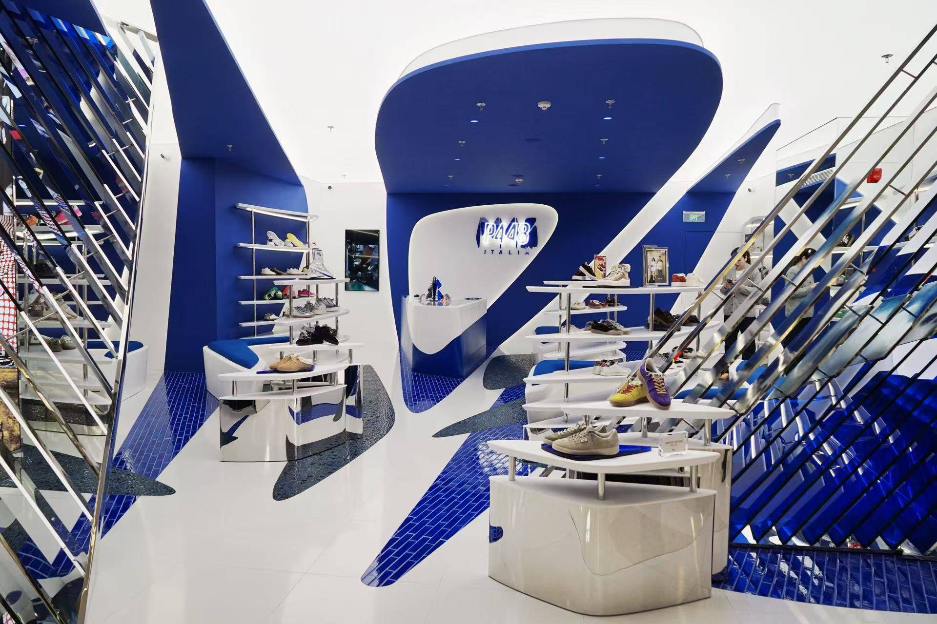 店铺空间由国际著名设计师Woody Yao特别构思执笔。他将“P448”这一品牌标识重新解构重组为立体画像。从展架、座位到店内陈设,皆由品牌标识衍生而来,构筑出一座可穿行、可触摸的艺术空间。入口的巧妙切割形成视觉通廊,链接内外场景;而室内简洁的界面与富有雕塑感的品牌元素并置,生动烘托出P448兼具趣味与深度的创意内核。