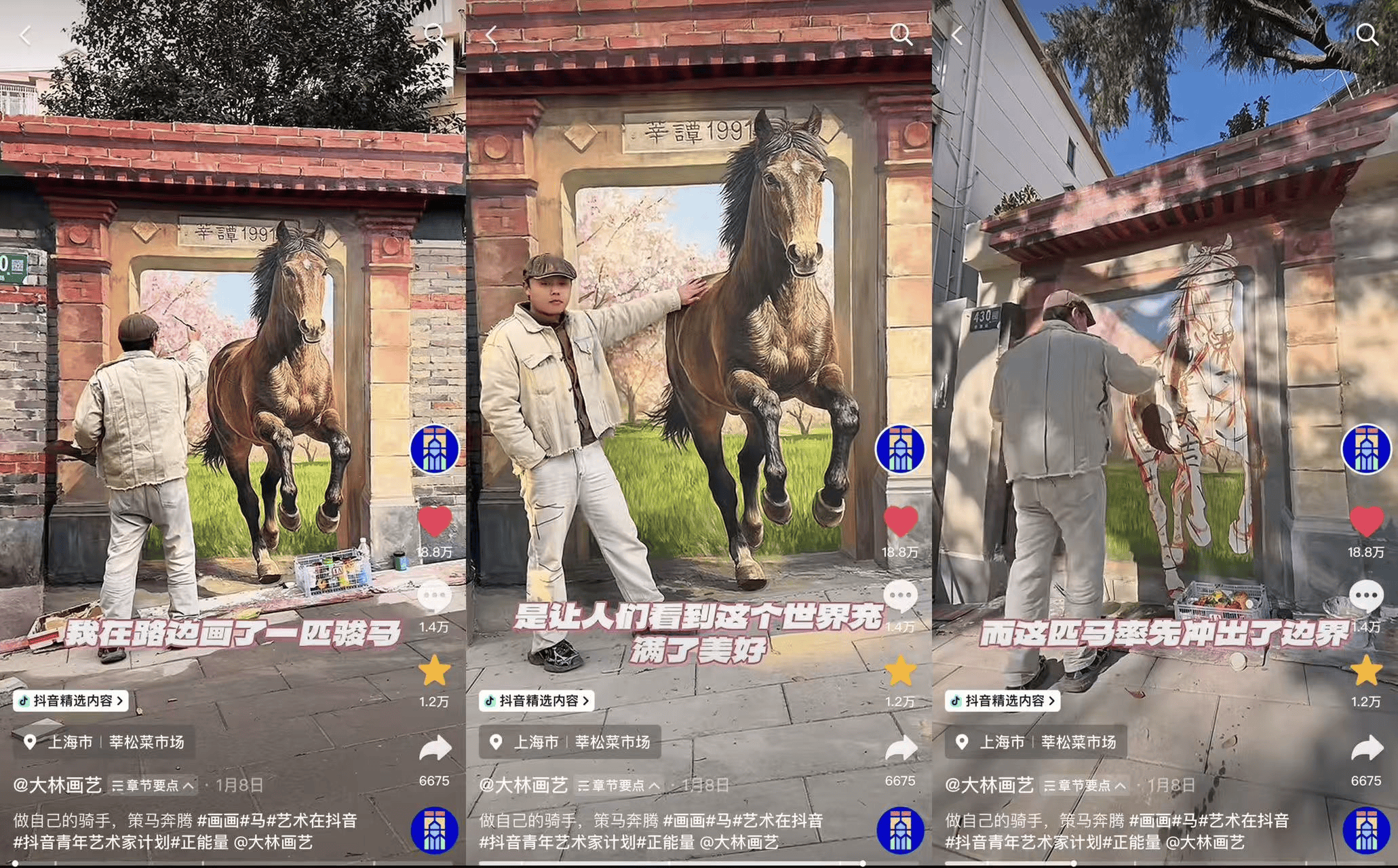 @大林画艺 的街头骏马画作便是这片宇宙中的一处生动缩影。达人走出传统画室,将城市砖墙变为艺术舞台,以马年为主题展开创作。作品笔触灵动,骏马仿佛即将挣脱墙面束缚、奔腾而出。从岩壁到宣纸,从青铜到橡塑,如今,这匹马从城市街头一隅冲了出来,为生活中奔行奋斗的人们打开了一扇肆意驰骋的大门。驻足于此,每个人都能于平凡生活中完成一次精神世界的“微小出逃”。借助其意象,达人传递希望每个人都能“做自己的骑手”的美好祝愿,艺术创作的共鸣价值也在路人们的驻足称赞,以及随着骏马奔腾而出的浪漫春意中无限蔓延,获赞18.8万。