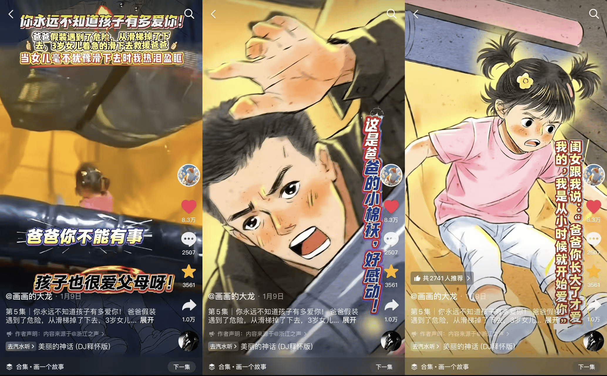 @画画的大龙 则以日常生活中的真实片段为灵感,用手绘漫画记录爸爸假装遇到危险,年幼的女儿挺身而出,勇敢“救援”家人的感人瞬间。日常生活的艺术化表达以直击人心的情感力量提升了创作的感染力,既传递了亲子之间真挚的暖心情谊,也引发对于“善良”等优良品质的讨论,被网友评论“红了眼眶”,获赞8.3万。