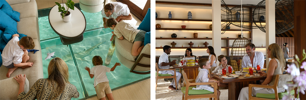• Ithaa水下餐厅参观:全家可在全球首座全玻璃水下餐厅享用精致小食,置身于珊瑚礁与鱼群环绕的奇幻景致中,象征“深海团圆,亲情永驻”。