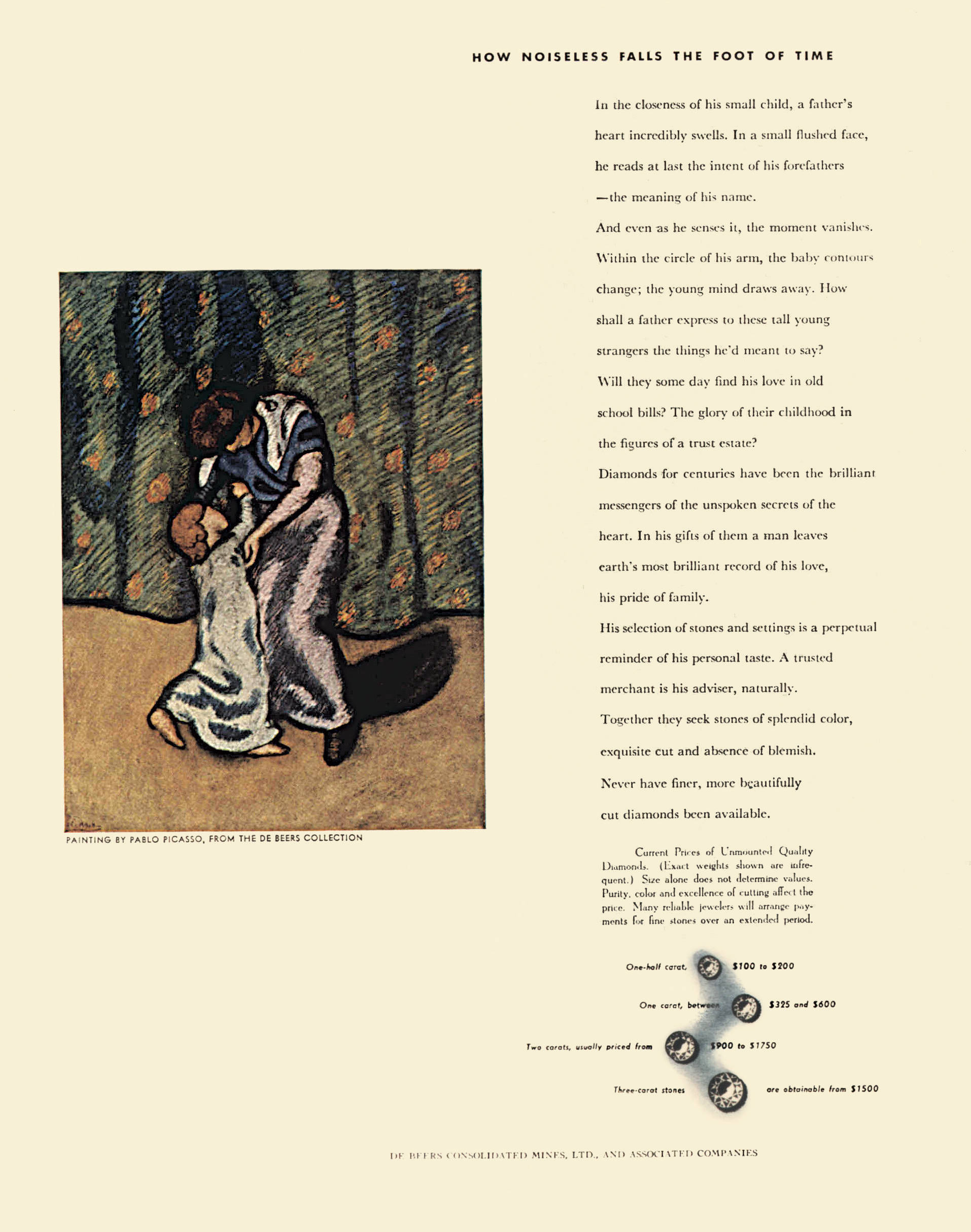 1940年左右,戴比尔斯广告刊载由巴勃罗·毕加索(Pablo Picasso)