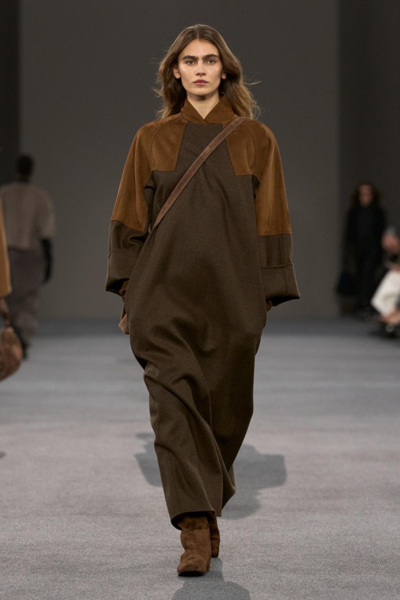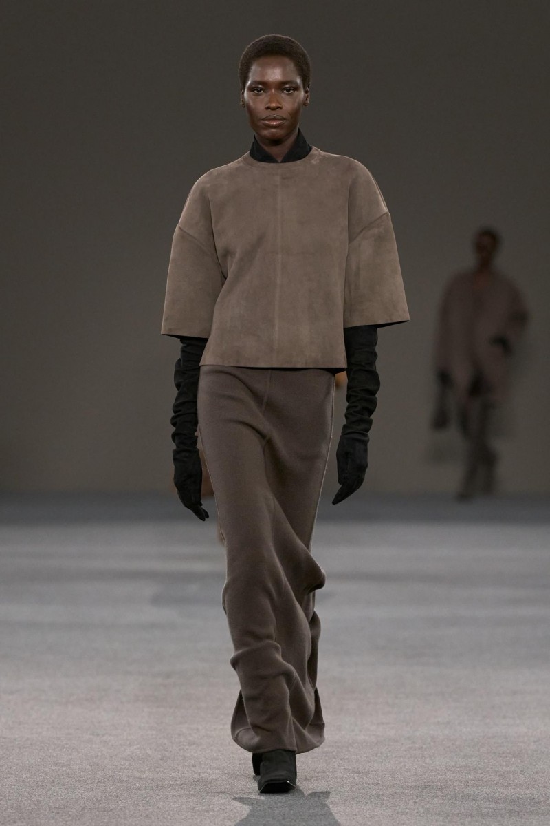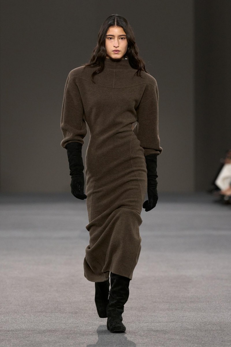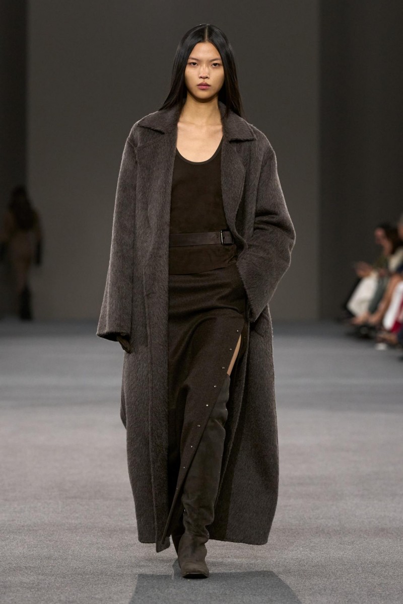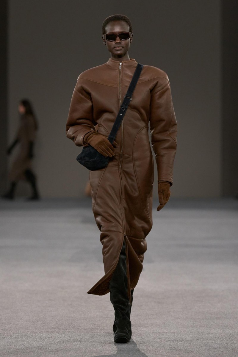 贴合髋部线条的拼接羊绒长裙、触感细腻的麂皮短款中性束腰上衣、柔软超平中长靴,金属铆钉细节,以及饰以磨砂皮革肩章的外套——那些源自“黑暗时代”语汇的设计元素,在当下语境中被重新转译,展现出鲜明而直接的现代力量。