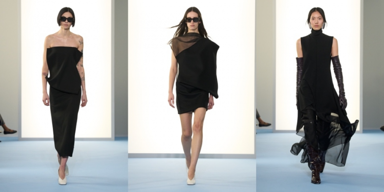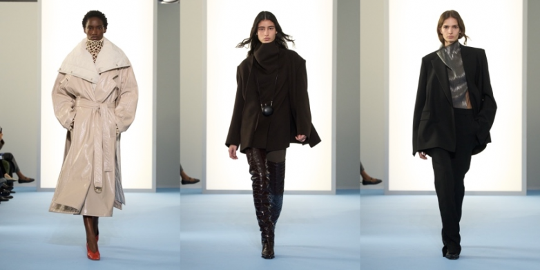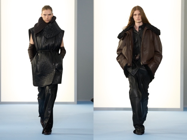 本季延续品牌风格底色,将 SPORTMAX 标志性双层结构面料(doublé)作为画布,探索廓形的实验艺术,尤其聚焦于领口设计。对比与并置成为另一重要主题:麂皮与皮革交映成趣,可拆卸衣领彰显对比感,服饰在长短之间骤然切换,哑光与亮泽、清透与不透质感自由碰撞。