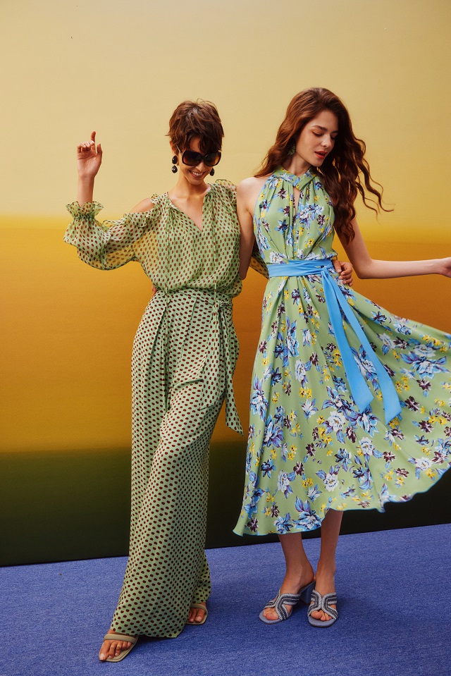 当马拉喀什的晨光苏醒,马若雷勒花园便开启了一场光与色的缄默交响。本季系列以 “Sun-Kissed in Majorelle马若雷勒花园”为主题,将北非炽烈的日光、神秘的自然意象与品牌标志性的女性力量美学交织相融。从花园中标志性的马若雷勒蓝,到被阳光亲吻的温暖色调;从蔓延的绿意,到精致的伊斯兰建筑线条,DVF以印花、面料与剪裁的匠心组合,通过时装语言诠释女性在身份、精神与选择上的自由觉醒,再现这座传奇花园的静谧、深邃与蓬勃生命力。