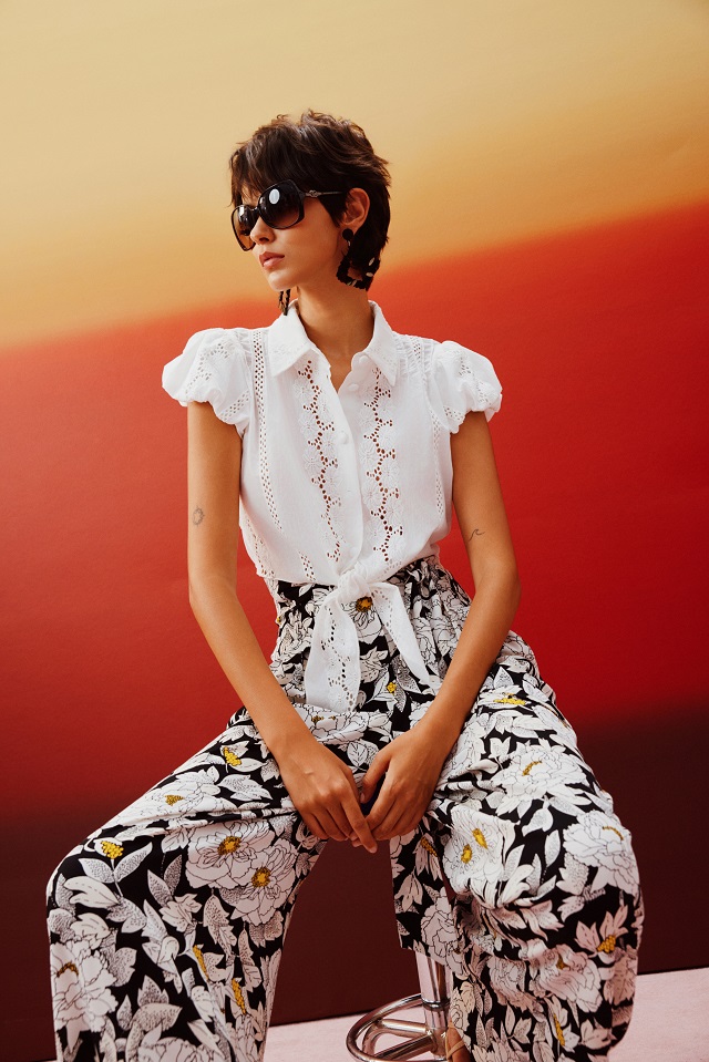 「Jelly Polka Dot果冻波点」以花园植物浅绿为底,点缀棕红波点,清透果冻光泽与复古波点相映成趣,勾勒灵动自在的摩登气韵。「Island Orchid 幻彩兰花」以兰为灵感,诠释优雅与坚韧的共生。幻彩色调赋予印花神秘而流动的视觉层次,犹如女性在不同场景中自如流转,始终保有从容姿态与内在力量。「Wall Flower 彩色花谱」撷取花园盛放花卉的斑斓色彩,织就绚烂视觉诗篇,每一抹色彩皆诉说着女性丰盈的内心与无尽可能。「Accro Geo 迷宫几何」则从花园建筑的窗棂与廊柱中汲取灵感,以简洁而富有韵律的几何线条。“破剪生花”的镂空细节与“马拉喀什之结”的系带设计,在身体律动间勾勒若隐若现的曲线,诠释女性自在而优雅的初春姿态。