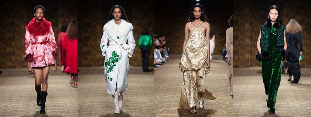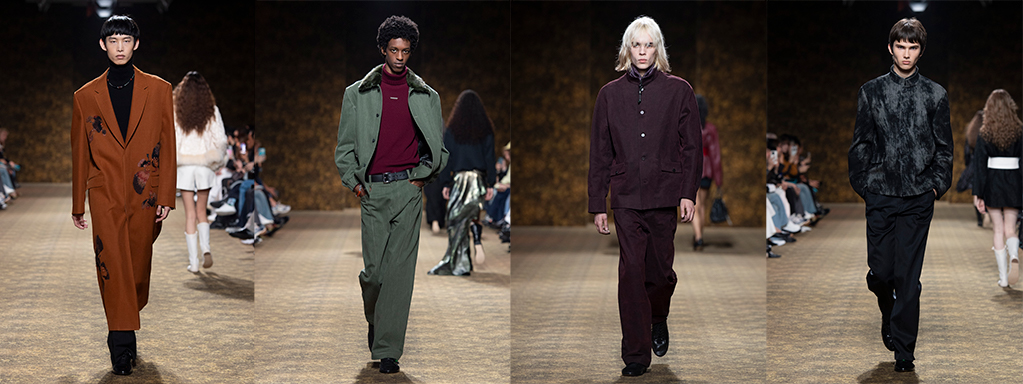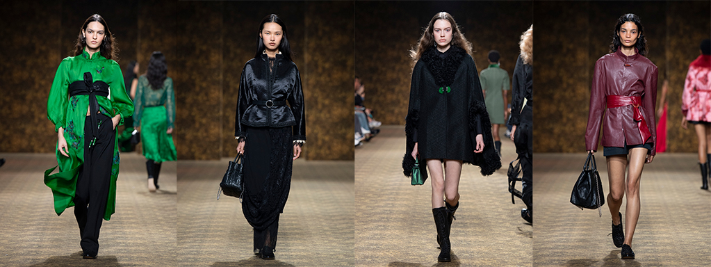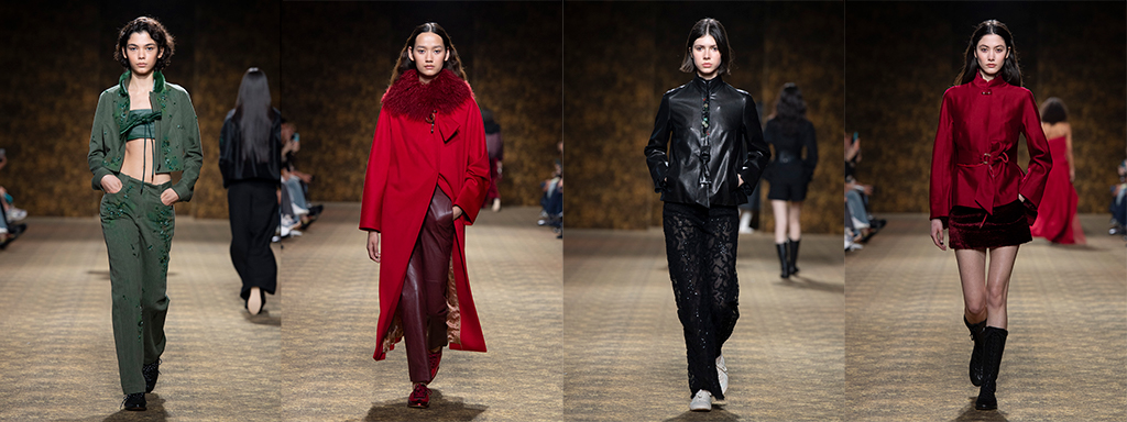 玉作为本季的精神符码,小至玉片镶嵌于刷色牛仔,随步伐轻响,为日常材质注入玉石的温润光泽;大至平安扣系于身,化为贴身的精神标记。开版图腾以山水、鹿纹与宫廷出游为织锦意象,使服装如同一幅随行展开的画卷。扶桑花、牡丹与团花构筑繁盛流动样貌;材质大幅出现金属与翻毛,在冷暖间构筑立体对比。男装延续盛世的饱和能量,透过印刻刺绣与仿旧处理让时间在布料留下痕迹。西装外系腰封、方形连袖与中式镶边口袋,构筑刚劲而内敛的细节,细小玉石装饰与毛料点缀领口、袖口,营造如壁画般的质地,在历史感与当代剪裁间取得精准平衡。