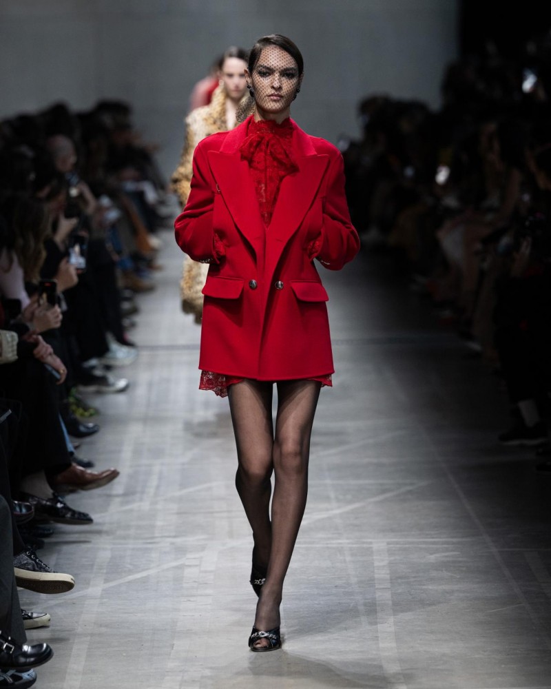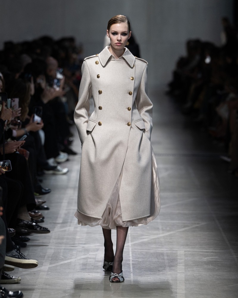 ERMANNO SCERVINO从不推崇制服——而是从内与之融为一体,以裁剪高定礼服般的缜密心思,去改造它,颠覆它。骑装外套与斗篷塑造精准而内敛的廓形;缀满水晶的欧根纱与金色镂空花边,从裙摆悄然逸出;被数百道骨架撑起的裙摆骤然绽放,呈现出惊喜视觉。