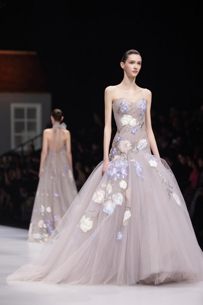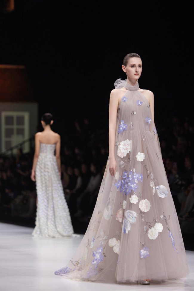 本季系列将微观的精致放大至现实的秀场之中,以女孩的成长心事为脉络,将藏于玩具屋中的美好向往,化作一针一线的高定诗意。女孩幼时憧憬一间属于自己的小屋,安放心爱衣裳与烂漫幻想;长大之后,以华服筑造心灵居所,盛放对生活与美的全部热忱。礼服之上,繁花皆为纯手工彩绘,笔触细腻灵动,色彩温润雅致,宛若将玩具屋里珍藏的春日花园,妥帖安放于衣袂之间。轻盈薄纱与挺括缎面温柔相拥,古典廓形与现代剪裁交织成诗,让童年对美的初心,在岁月深处静静生长、优雅绽放。
